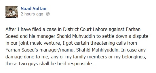 Now, almost 2 hours ago, Saad Sultan posted something very unusual on Facebook which declared some serious accusations on Farhan Saeed. The post is as follows: